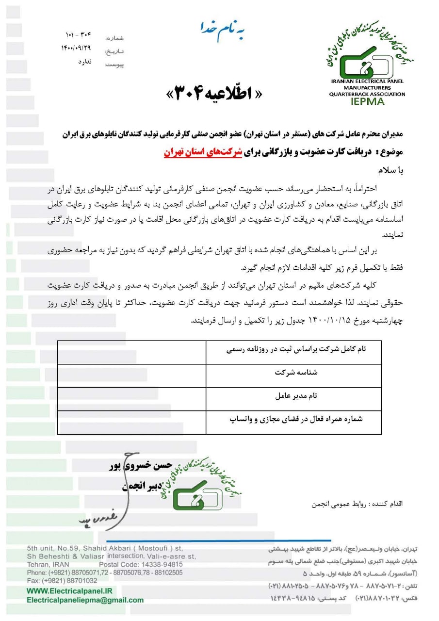 دریافت کارت عضویت و بازرگانی برای شرکت های استان تهران - اطلاعیه شماره 304