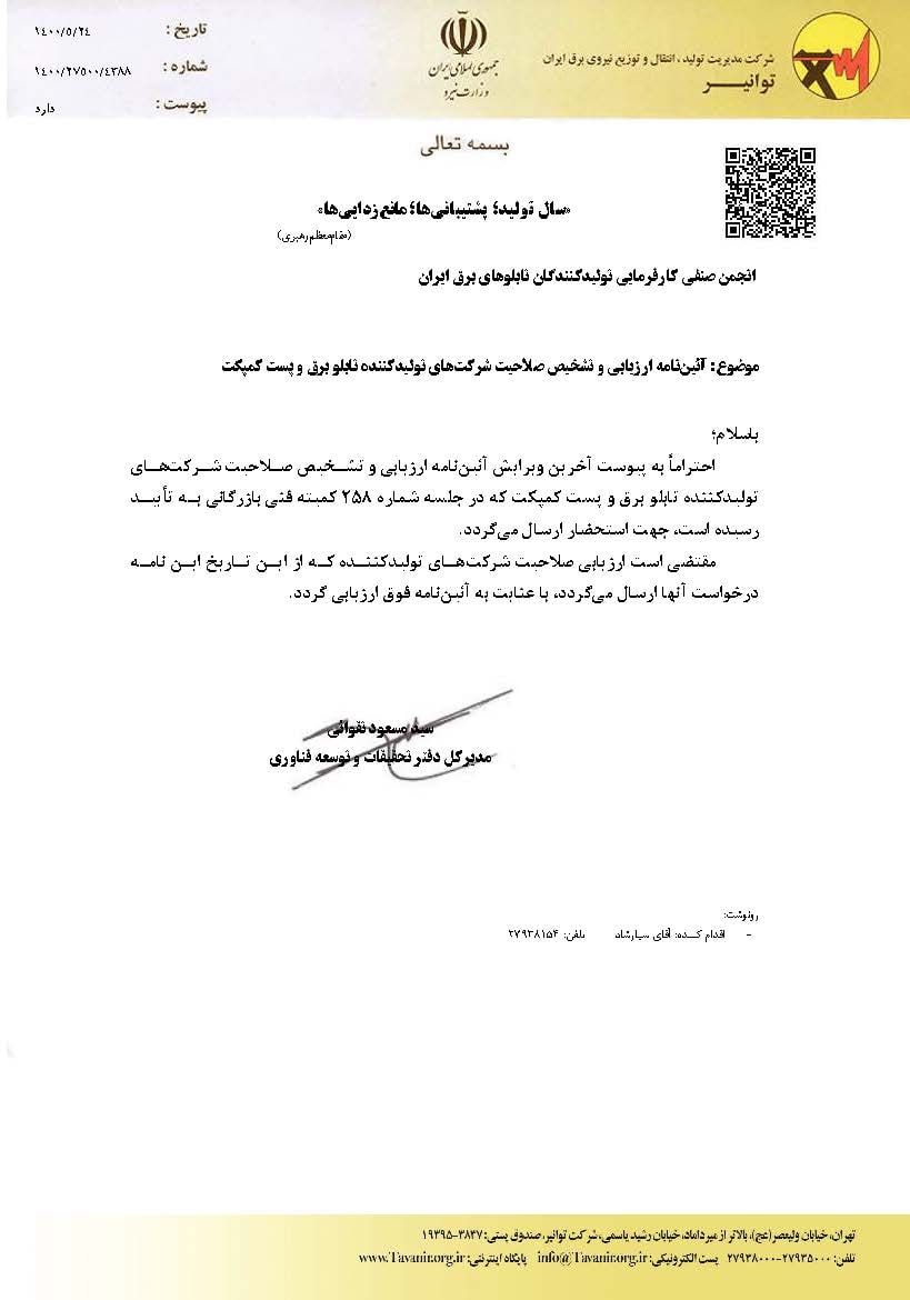 انجام ارزیابی تحت آئین نامه جدید تشخیص صلاحیت تولید کنندگان تابلوهای برق و پست های کمپکت - اطلاعیه