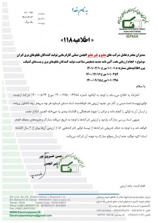 انجام ارزیابی تحت آئین نامه جدید تشخیص صلاحیت تولید کنندگان تابلوهای برق و پست های کمپکت - اطلاعیه شماره 118