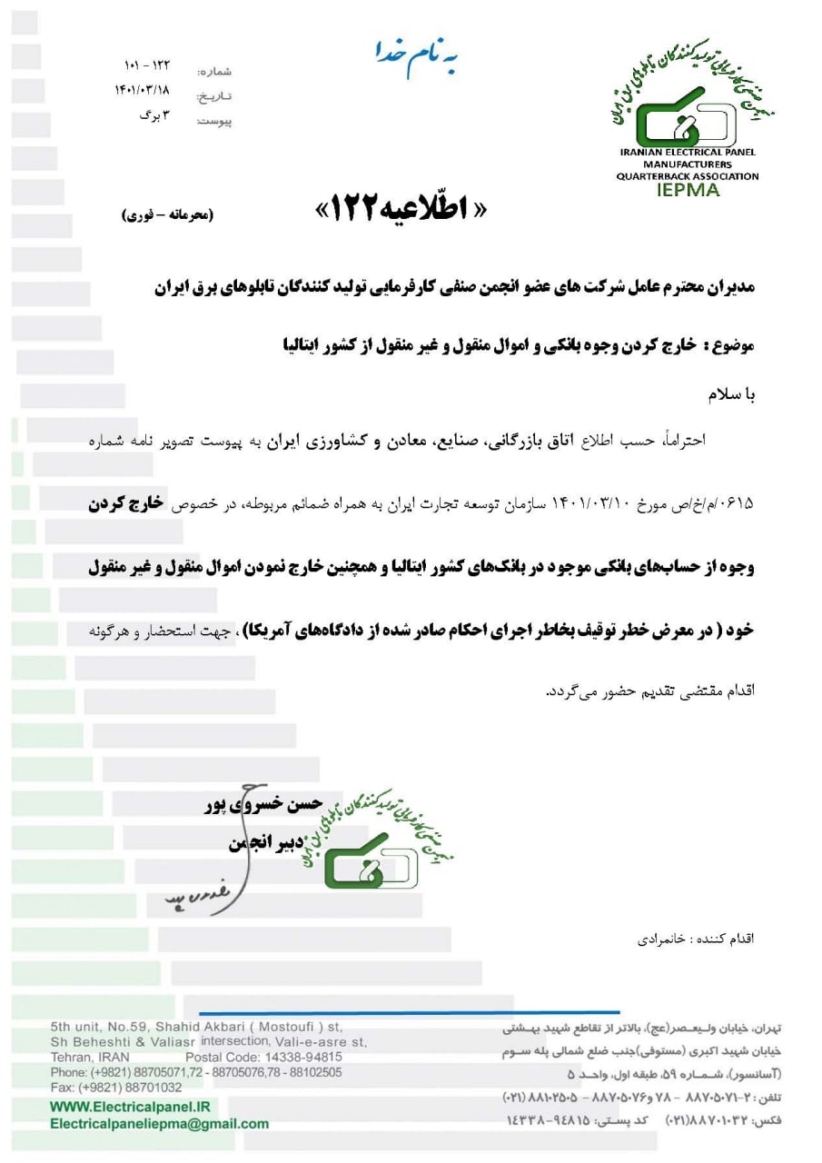 خارج کردن وجوه بانکی و اموال منقول و غیر منقول از کشور ایتالیا - اطلاعیه شماره 122