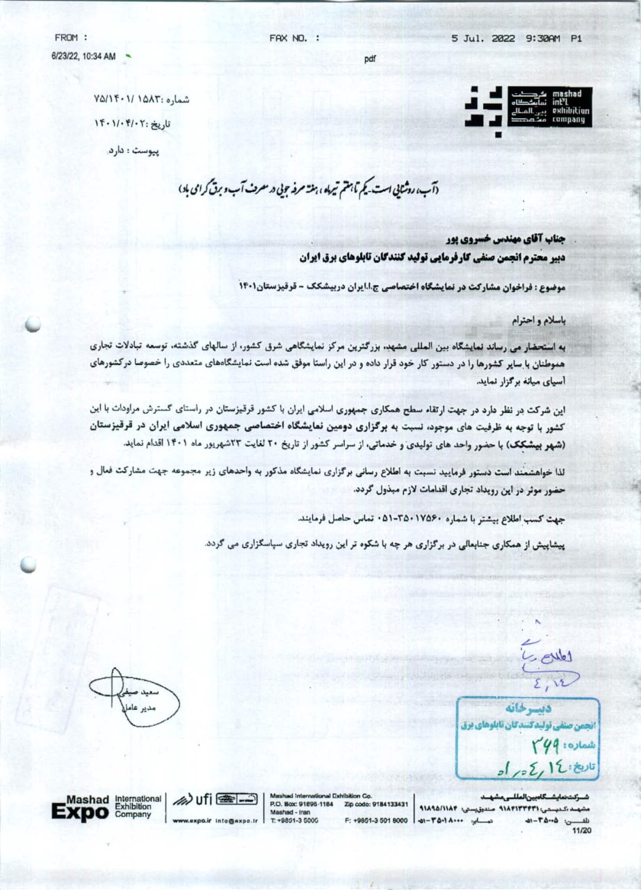 نامه شرکت نمایشگاه بین المللی مشهد در خصوص "فراخوان مشارکت در نمایشگاه اختصاصی ج.ا.ایران در بیشکک قزقیزستان از تاریخ 20 لغایت 23 شهریور ماه سال 1401" جهت استحضار وبهره برداری مقتضی تقدیم حضور می گردد.