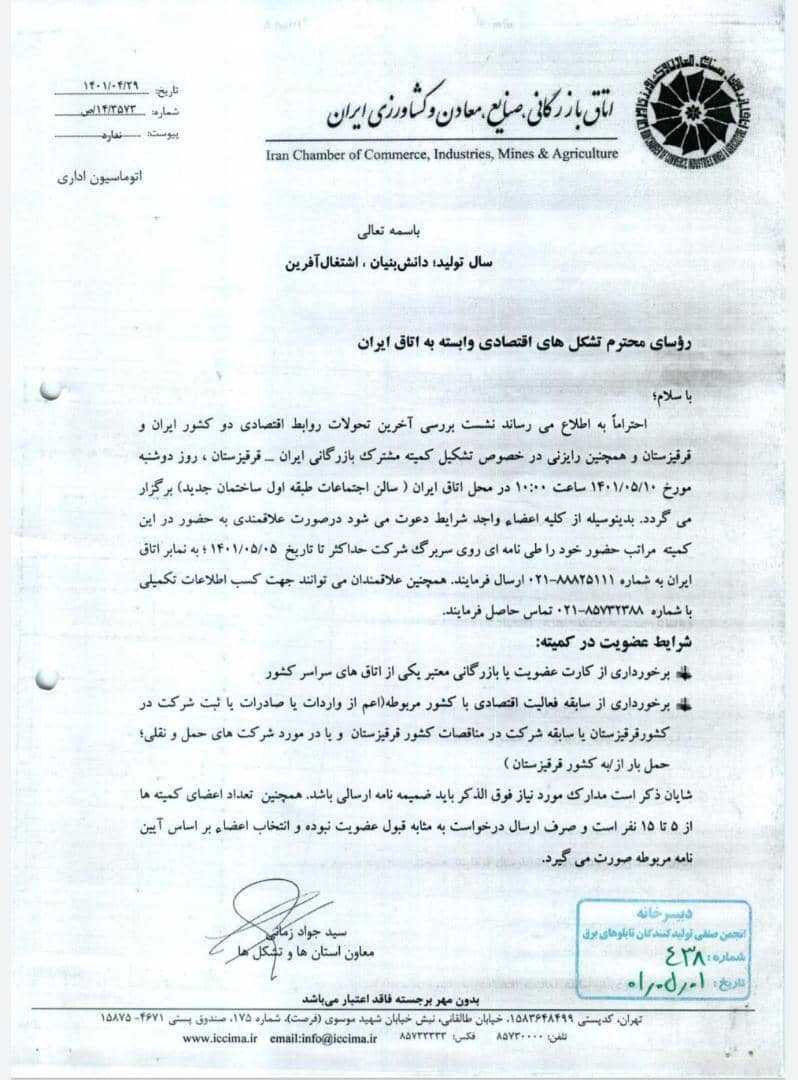 نامه اتاق ایران در خصوص " تشکیل کمیته مشترک بازرگانی ایران - قرقیزستان در روز دوشنبه مورخ 1401/05/10 "