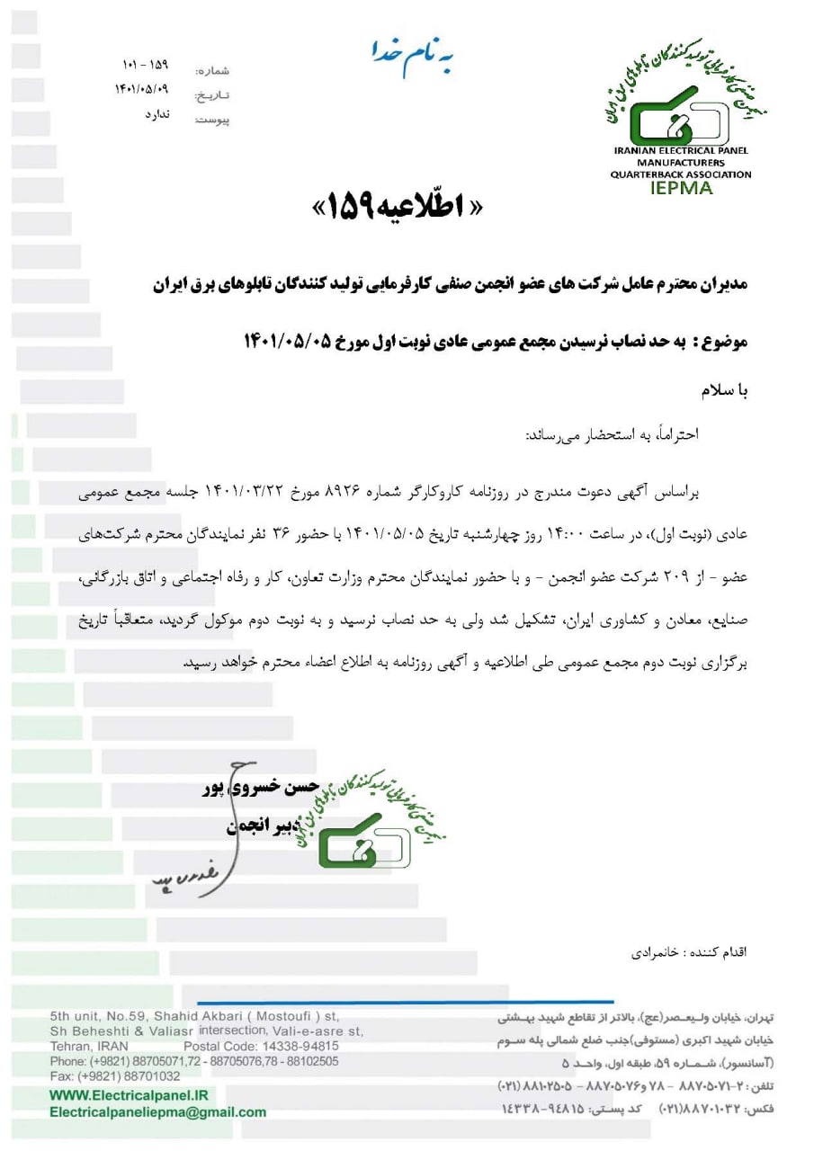 به حد نصاب نرسیدن مجمع عمومی عادی (نوبت اول) مورخ 1401/05/05 - اطلاعیه شماره 159