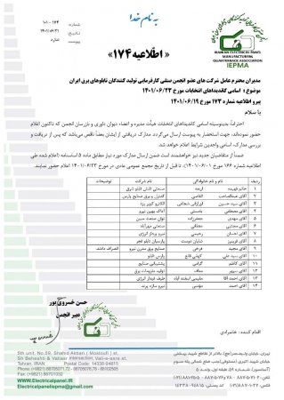 اطلاعیه ویژه: فهرست کاندیداهای مورد تایید انجمن صنفی کارفرمایی تولید کنندگان تابلوهای برق ایران در