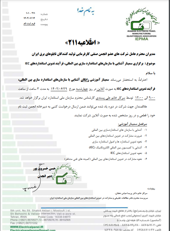 طالبی در تاریخ 18 شهریور 1402, 17:20 408 اطلاعیهبرگزاری سمینار آشنایی با سازمان های استاندارد سازی بین المللی فرآیند تدوین استاندارد های IEC