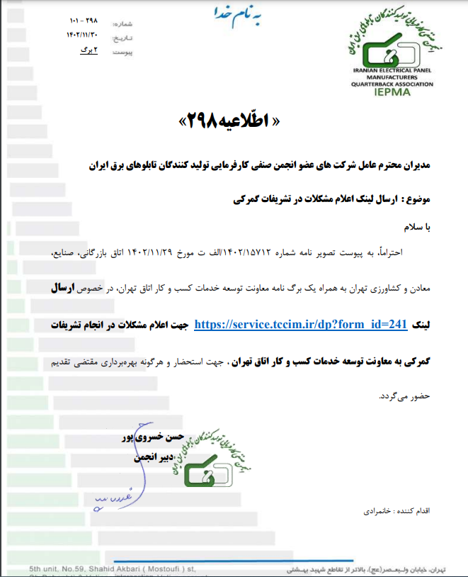 اطّلاعیه 236 پیرو درخواست انجمن صنفی کارفرمائی تولید کنندگان تابلوهای برق ایران در خصوص رفع مشکلات