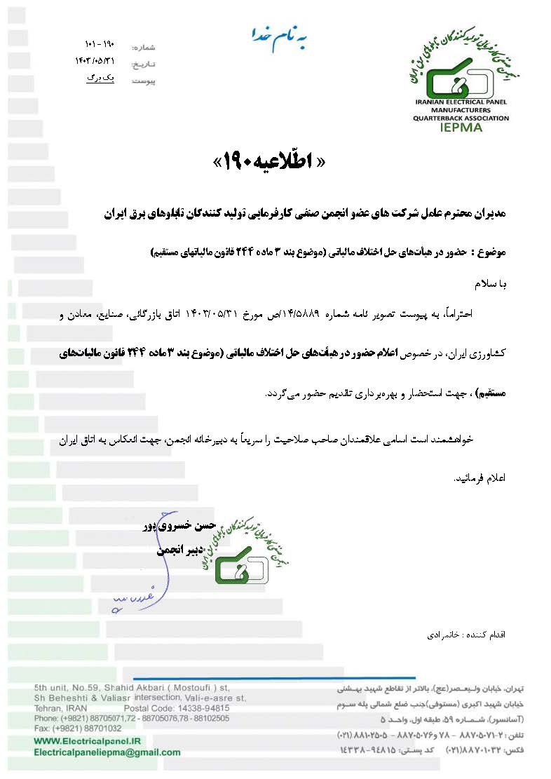 انجمن صنفی تولیدکنندگان تابلوهای برق ایران حضور در هیأتهای حل اختلاف مالیاتی (موضوع بند 3 ماده 244 قانون مالیاتهای مستقیم) - اطلاعیه شماره 190