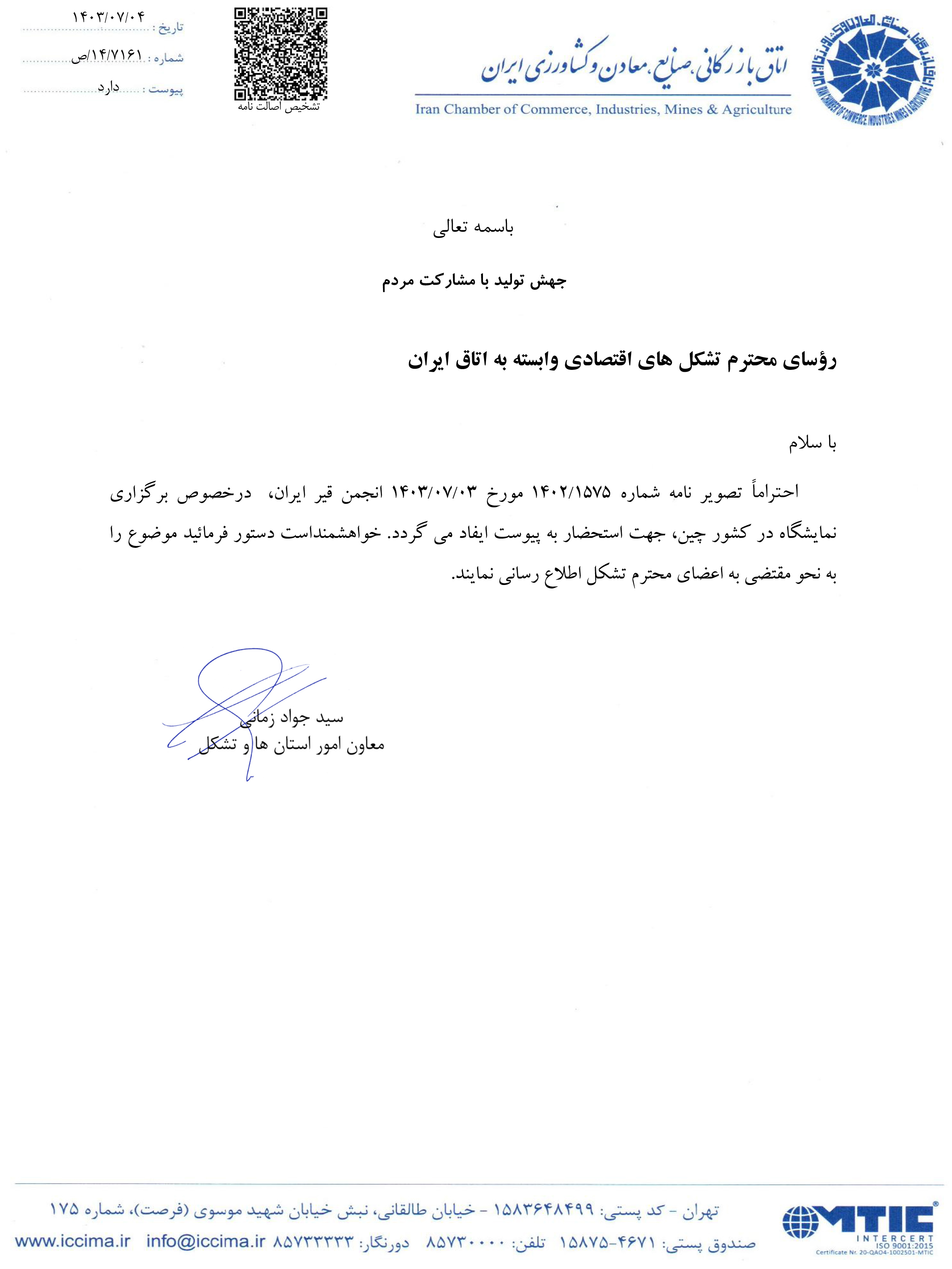 نامه اتاق ایران در خصوص " درخواست اطلاع رسانی برگزاری نمایشگاه در کشور چین "