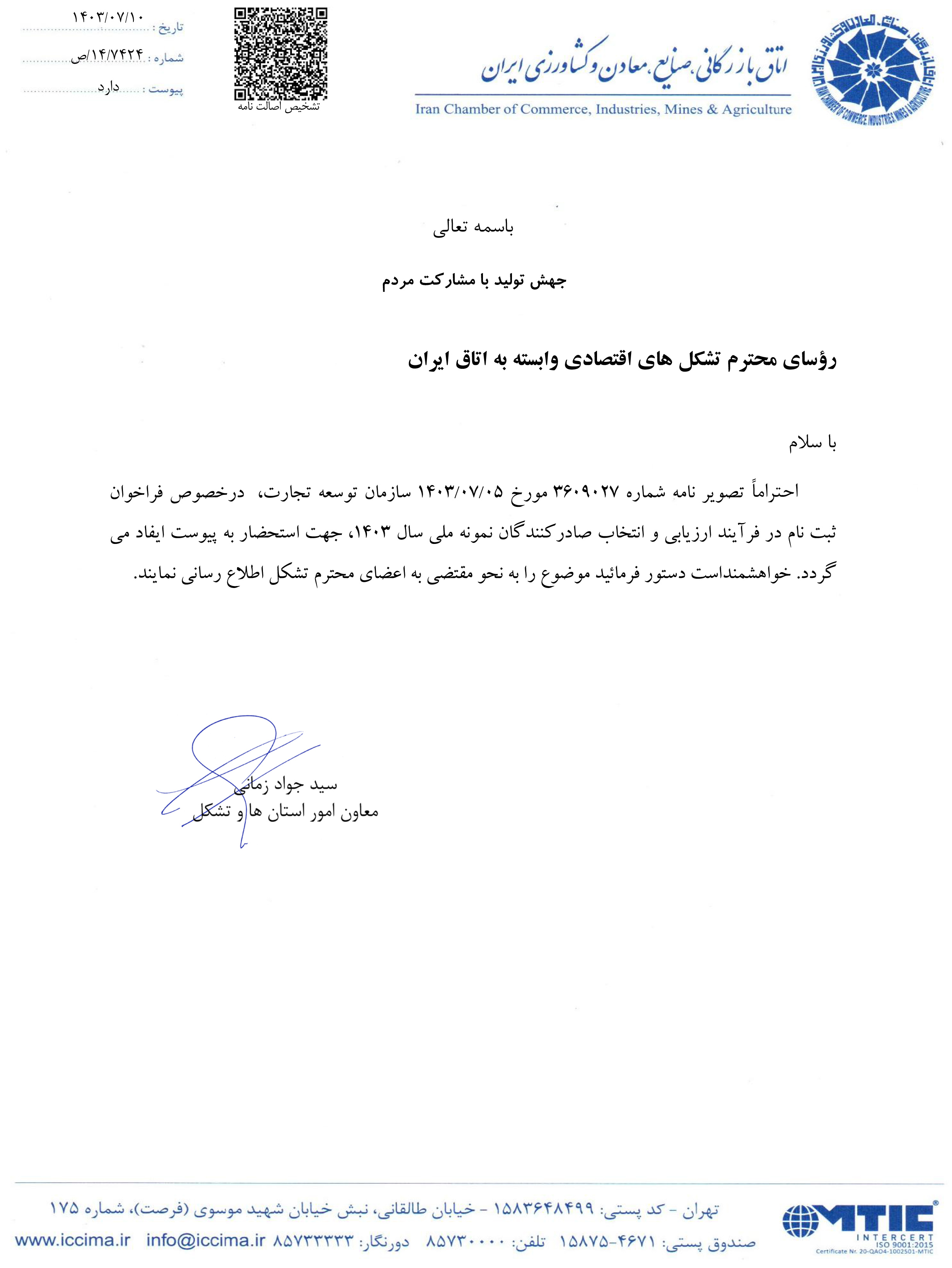 نامه اتاق ایران در خصوص " فراخوان ثبت نام در فرآیند ارزیابی و انتخاب صادرکنندگان نمونه ملی سال 1403 "