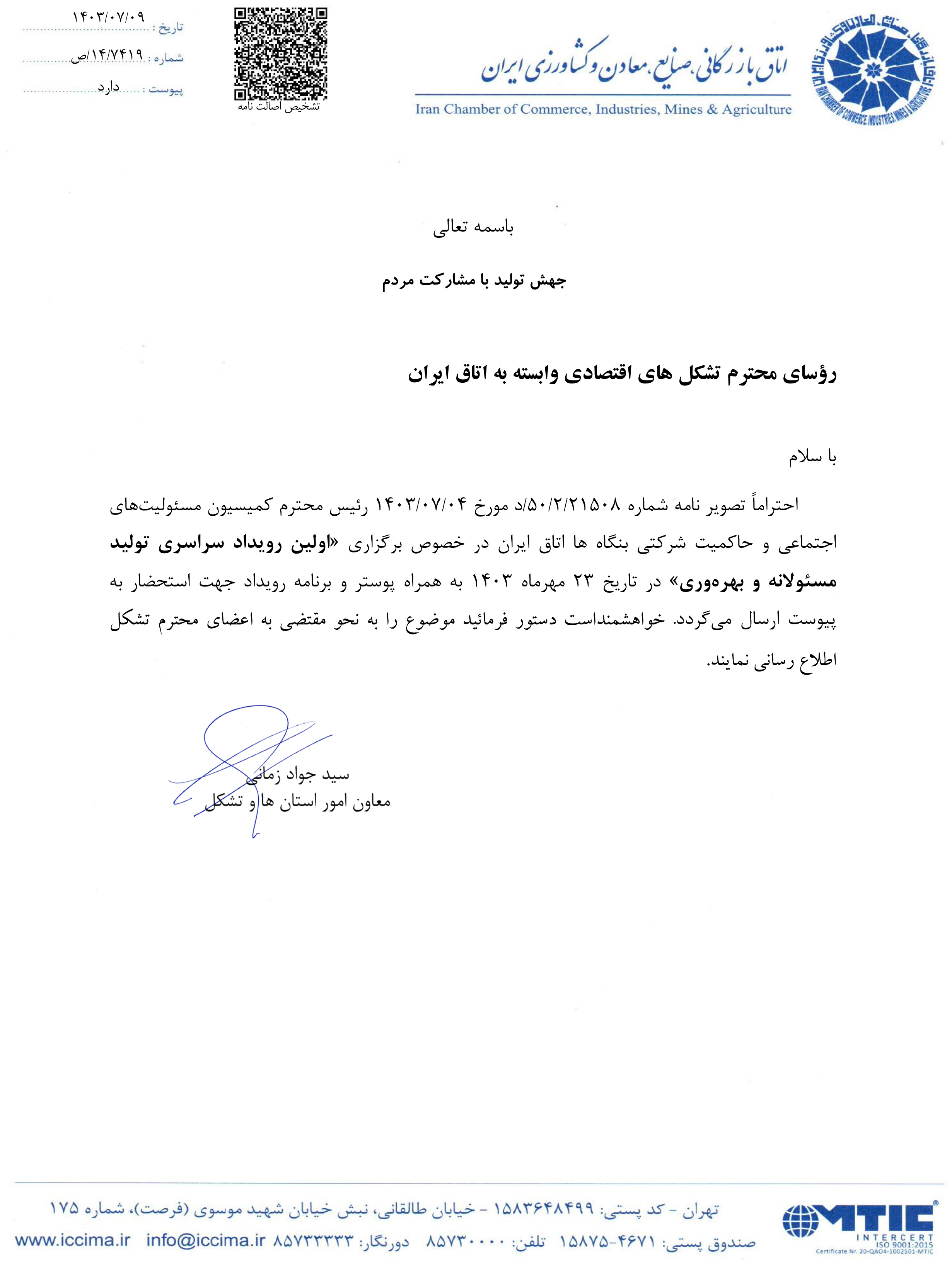 اتاق ایران در خصوص " دعوت از مهمانان همایش تولید مسولانه "