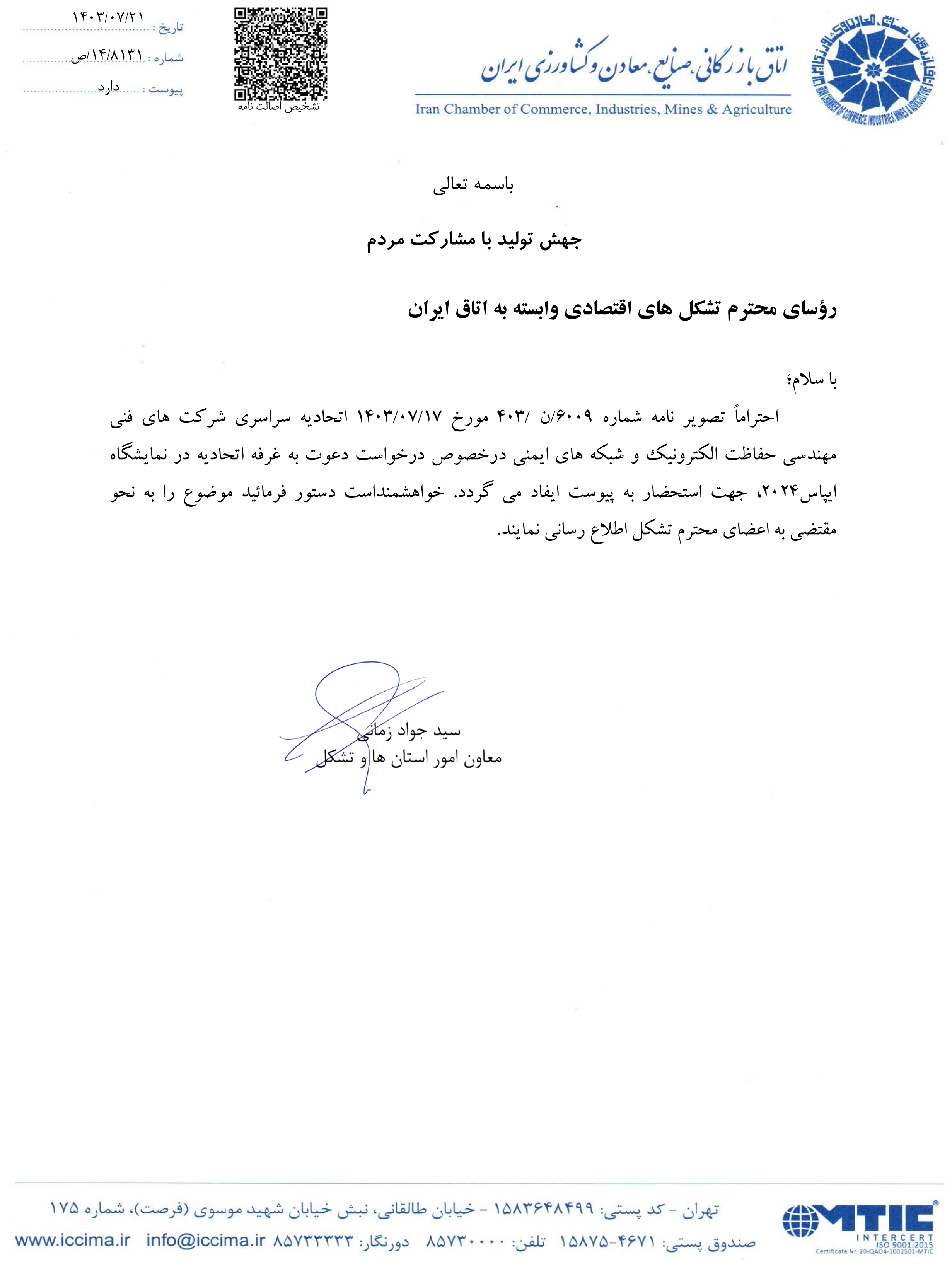 نامه اتاق ایران " درخواست دعوت به غرفه اتحادیه در نمایشگاه ایپاس2024 "