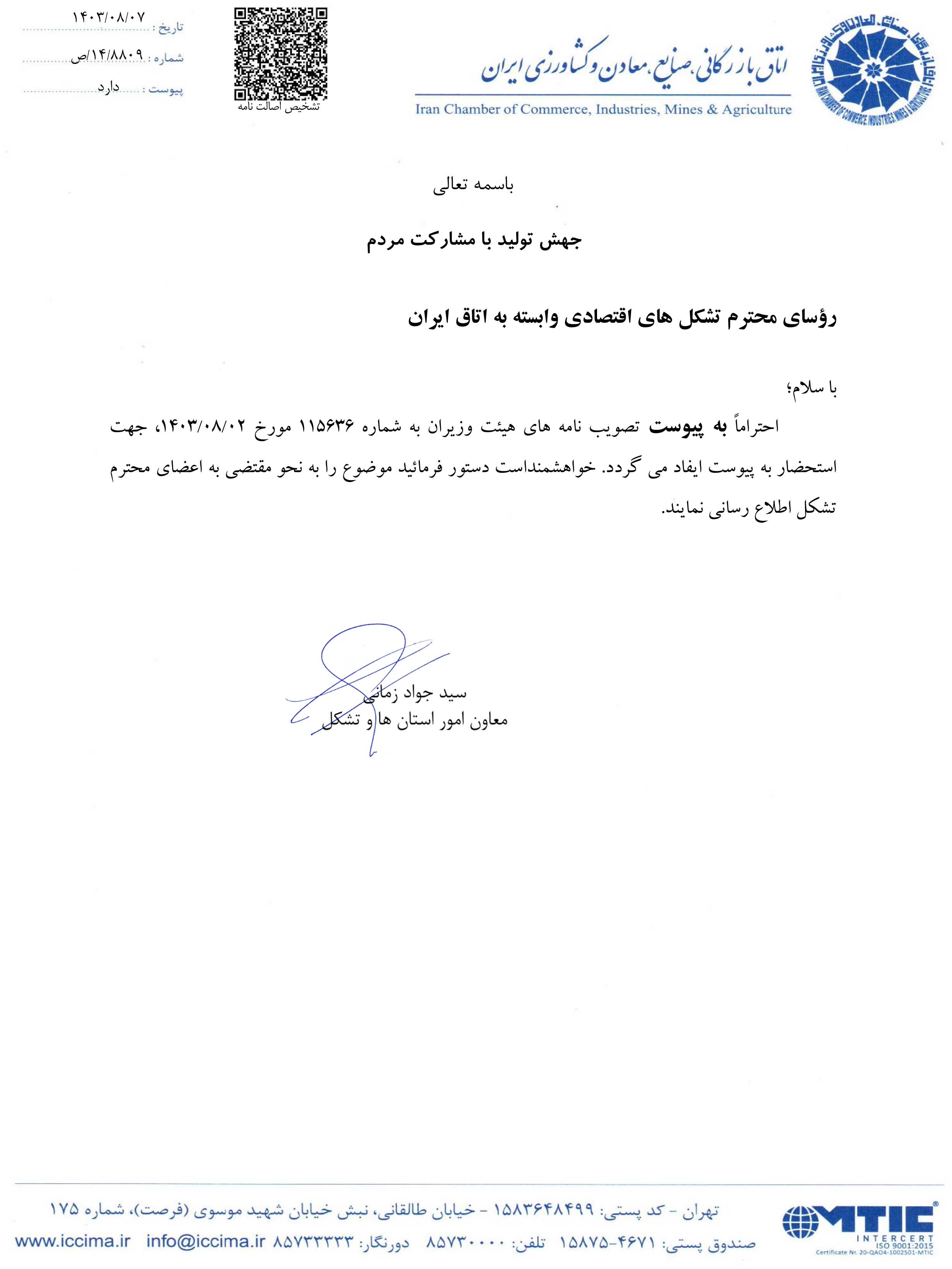 اطلاعیه 289 حسب اطلاع اتاق بازرگانی، صنایع، معادن و کشاورزی ایران به پیوست تصویر نامه شماره