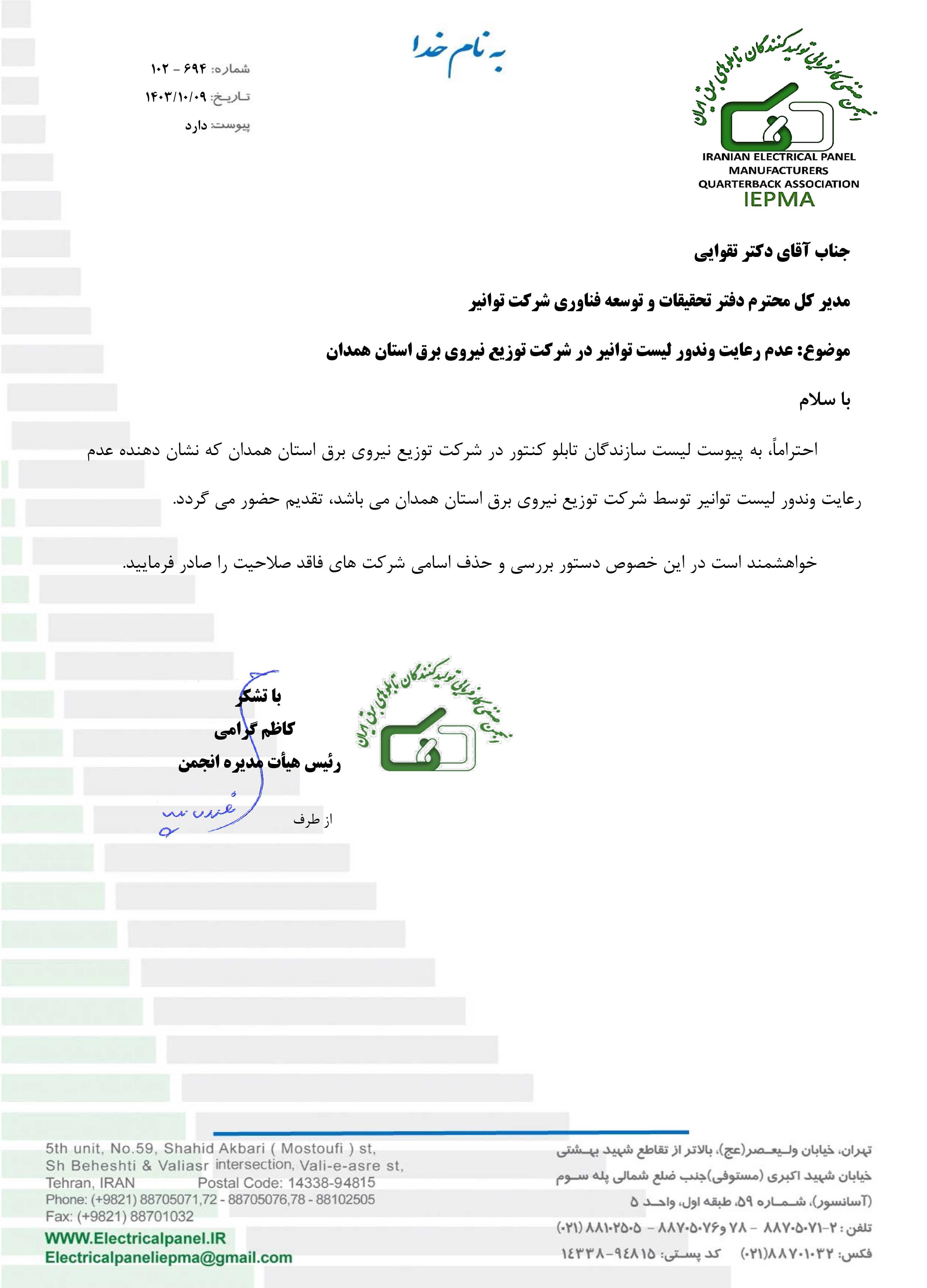 نامه به توانیر - دکتر تقوایی - عدم رعایت وندور لیست توسط استان همدان۶۹۴