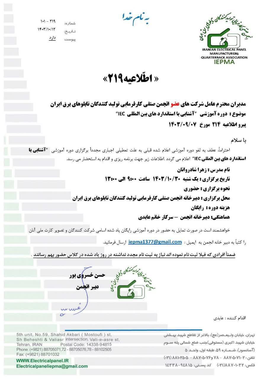 اطلاعیه ۲۱۹ در خصوص دوره آموزشی " آشنایی با استانداردهای بین المللی IEC "